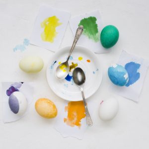 Beim Eierfärben kann man viele kreative Techniken ausprobieren. Besonders einfach sind Kaltfarben. Sie werden in kaltem Wasser und einem Esslöffel Essig aufgelöst. Die frisch gekochten, noch warmen Eier baden einige Minuten darin. Je länger sie im Farbbad liegen, desto kräftiger wird die Farbe. Diese Methode eignet sich vor allem gut für kleine Kinder ab etwa zwei Jahren. Mit alten T‑Shirts und dünnen Handschuhen bleibt die Kleidung von Farbtupfern verschont. Außerdem können Kinder so ganz in Ruhe ausprobieren, wie sich Farben verändern und mischen.